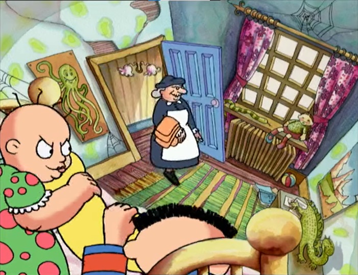 Here, after doing certain “pranks” that could have, in many ways, killed their nanny, they go through a few other nannies that happen to be animals. The first two of these are a snake and a spider, whom are all treated the same and pulled towards certain near-death experiences before running off. An alligator is the last one, who eats the kids and leaves them behind as reptile eggs they hatch from before the old nanny returns and the kids see her belongings are made of various animal pieces that cover the previous substitute nannies, indicating their nanny is a witch of some sort.