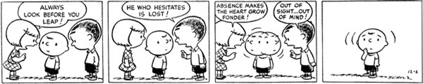 A good bit that easily sums up the feeling of being a kid and suddenly coming across proverbs in every day life, with Charlie Brown not having a single bit of dialogue being the best choice in pushing his relatable confusion.