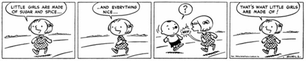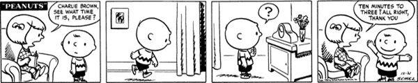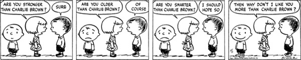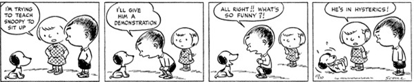A perfect example of 'kids-renegging-on-an-idea-and-being-kind-of-jerks-because-of-it', this strip wouldn't have worked the same if it had been the other way around. If it had been, it would have been the usual day-to-day sort of thing Charlie Brown deals with, but since he's the one who has the idea to swap pulling the sled up and then turn back on it with the classic "think I hear my mother calling," this joke works infinitely better. A lot of that may have to do with how some of the earlier Peanuts strips come off in hindsight in terms of how we know these characters, but seeing Charlie Brown be the jerk to Shermy makes this pretty funny.