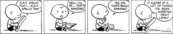It also works because of something that really stuck out to me upon revisiting the comics, which is I love Schulz's specific use of words; "It clears up a lot of things I've been worrying about lately" is a great way to emphasize the joke.