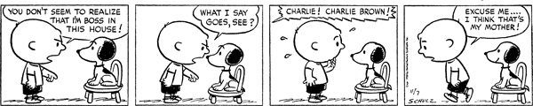 It's very rare to see Charlie Brown come off so jerk-y, especially to Snoopy. It is also equally rare to have an adult with actual dialogue in one of these strips instead of the kids just having a one-sided conversation, but that's what makes it work, almost like this was the one time where the joke necessitated actual written dialogue from -- not just an adult-- a parent. It's also a great joke about how, even though these kids exist in a universe where said adults are largely off-screen, the kids are still the kids. It also works because I seriously did not expect an adult to have dialogue as I was going through these.