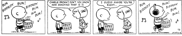 How many parent has had an experience like this? Sure, they are a lot nicer than Patty is here when they attempt to let their child know if something may be... a bit much, but the end result can always be the same. I love Charlie Brown's reluctant agreement that Patty may have a point about the drums and the way he deals with it is genius, a wonderful bit of child misunderstanding what the main issue, or request, may be.