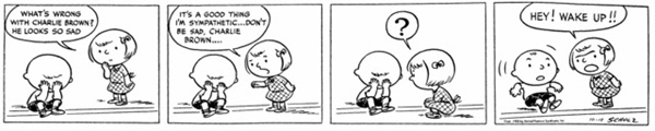 Reading this made me think that the punchline would have to do with Charlie Brown just sitting around thinking or the like. Instead, this really caught me off-guard and the slight ridiculouslness of it made me immediately love it. It really cracks me up that a child would have a nap sitting up on the side of the street while it also makes me kind of jealous, I miss the days I could easily just sleep anywhere at any time.